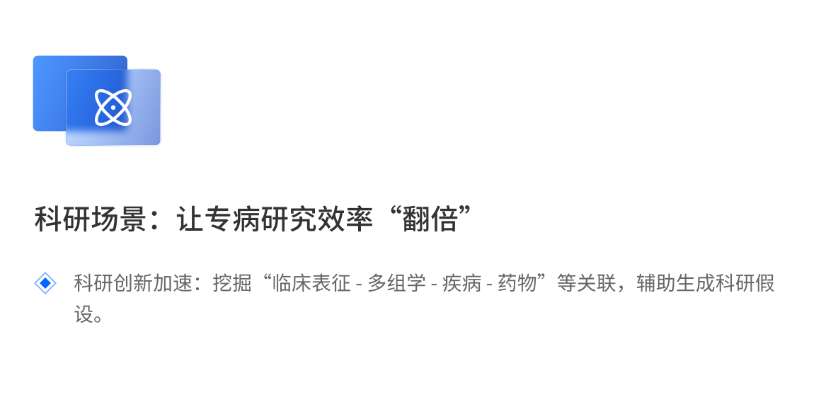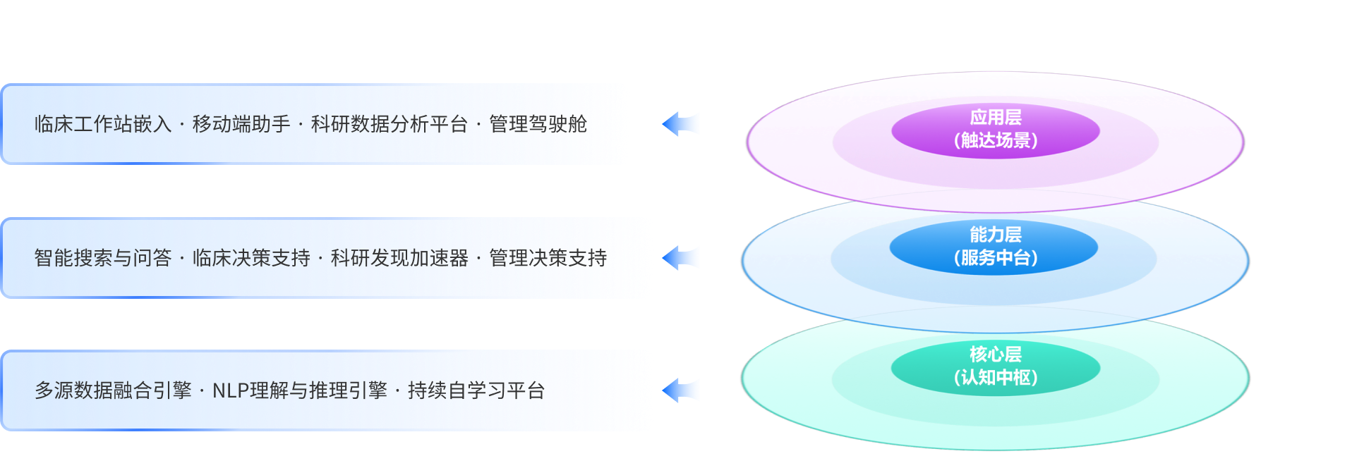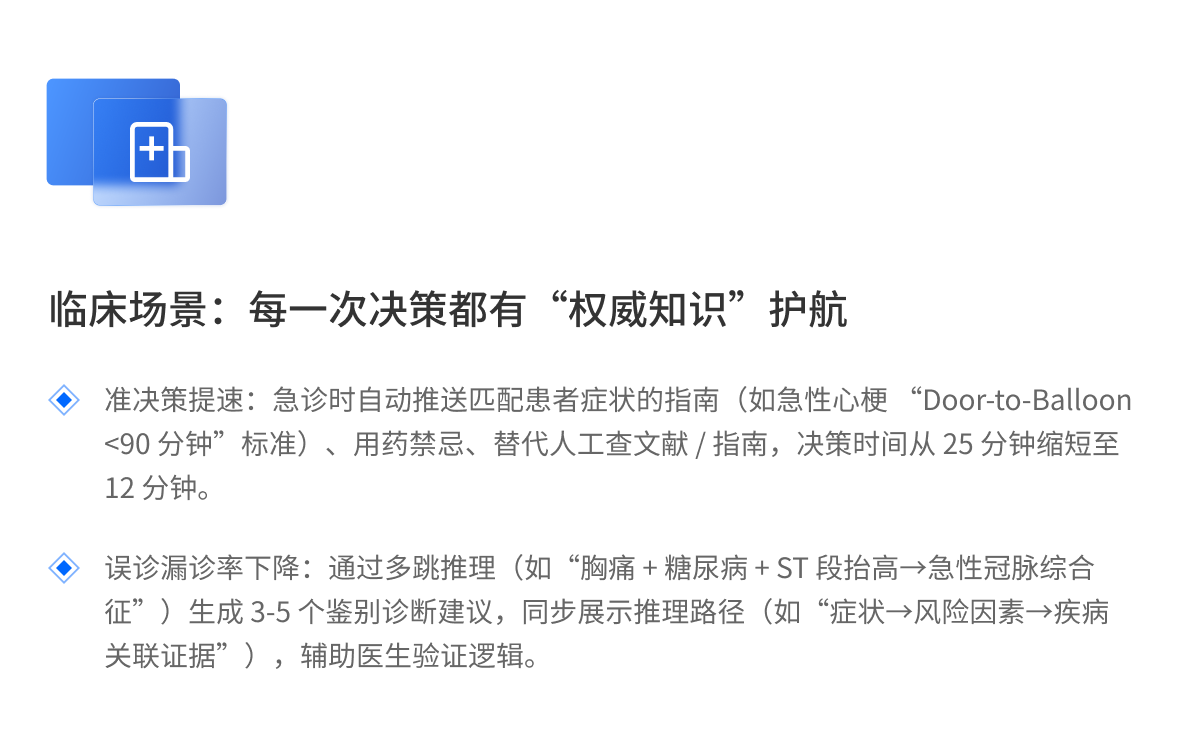 本产品作为国内首个“知识图谱 + 大模型”双驱动的医学智能引擎,深度整合医学知识与研究数据,构建覆盖“疾病 - 药物 - 基因 - 影像 - 临床”的全维度知识网络,为医院临床、科研、管理三大场景提供“实时化、精准化、可解释、安全化” 的智能支撑。